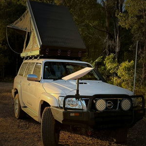 Pull into camp, clamp the mount to your bull bar or roof rack railing, slot in the Starlink dish, and you are connected. The elevated position gives you clearer sky coverage than setting the dish on the ground — especially useful when camped among trees or near a hillside.